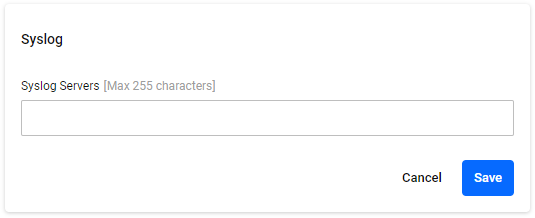 | Syslog Servers | − | String (Max 255 characters) | A list of external Syslog servers to forward event logs to. Set it in the format "Hostname or IPv4 Address:port number" (e.g. 192.0.2.10:3000). If the port number is omitted, 514 is used. You can also register multiple servers by separating them with a space character. Refer the release notes for the number of servers that can be registered. |