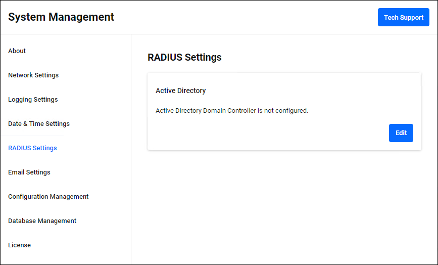 Configure the Active Directory domain to be linked with Windows Active Directory for RADIUS Authentication. Click the "Edit" button at the bottom right to enter edit mode.If an Active Directory domain is not registered, the message "Active Directory domain is not set." is displayed. If registered, information about the currently registered Active Directory domain is displayed.