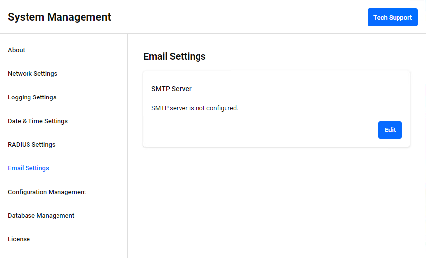 Configure the SMTP Server for sending emails. Click the "Edit" button to enter edit mode.Allied Telesis recommends that you configure the SMTP Server settings as they are essential for features such as the administrator account password recovery function and license expiration warning.