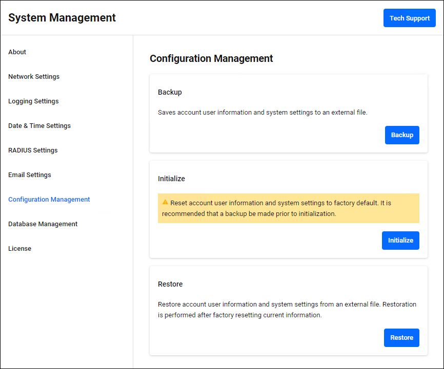 Saves administrator account information and system settings to an external file. Because the backup file does not contain information such as authentication policy data, it is not possible to completely restore the entire running system from this backup file.To perform a complete system backup, use "System Backup" on the System Management > About page.