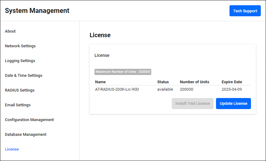 You can check and install the AT-RADgate software license (below is an example of when a trial license is installed).NoteFor information about licenses, refer to Accessing Management Interface > Installing Licenses.