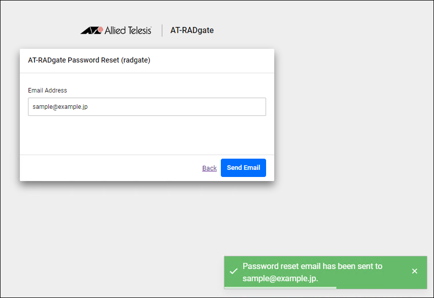You can access AT-RADgate password reset Web page from the following link. Please reset your password on this page. https://(AT-RADgate's IP Address)/public/page/password-reset/reset/xxxxxxxxxxxxxxxxxxx This page is valid for 10 minutes. Please change your password within this time. If you don't remember this mail, please ignore this email and your password will remain unchanged.