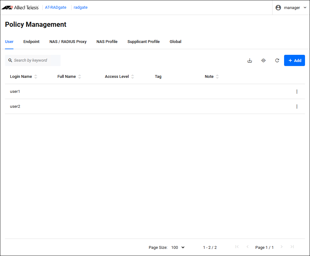 Clicking the "User" tab displays a list of User policies registered on AT-RADgate.