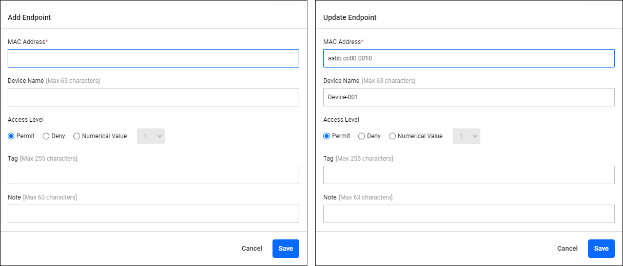 Policy Management > Endpoint > Add Endpoint/Update EndpointClicking the "Add" button in the upper right corner of the Endpoint page displays the Add Device dialog, allowing you to add a new Endpoint policy. Additionally, if you click the "Edit" menu for an Endpoint policy that has already been registered, the Update Endpoint dialog is displayed, allowing you to edit the Endpoint policy.