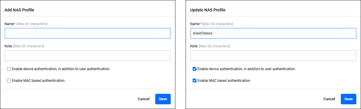 Policy Management > NAS Profile > Add NAS Profile/Update NAS ProfileClicking the "Add" button in the upper right corner of the NAS Profile page displays the Add NAS Profile dialog, allowing you to add a new NAS Profile policy. In addition, if you click the "Edit" menu on the far right of an already registered NAS policy, the Update NAS Profile dialog is displayed, allowing you to edit the NAS Profile policy.