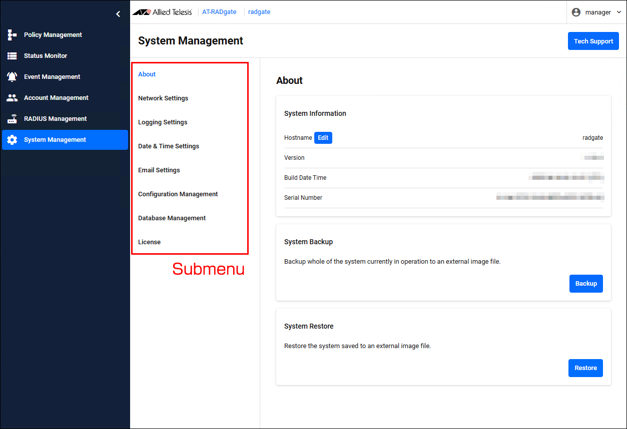 Table 1: Management column Display example Description AT-RADgate Clicking this displays the Status Monitor page. radgate The configured Hostname. Clicking this displays the System Management > About page. manager The currently logged in user name. Clicking this displays the "My Account" and "Logout" submenus.