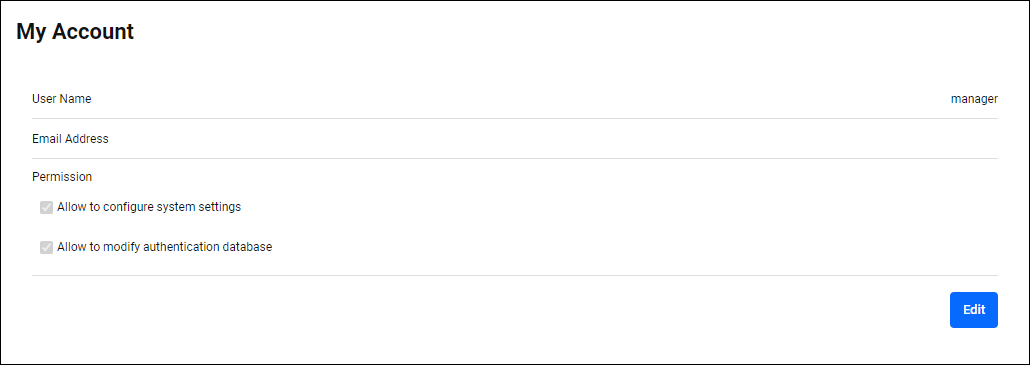 My Account page displays information about the currently logged in user. Click the “Edit” button to change settings.NoteFor more information about account settings, refer to References > Account Management.
