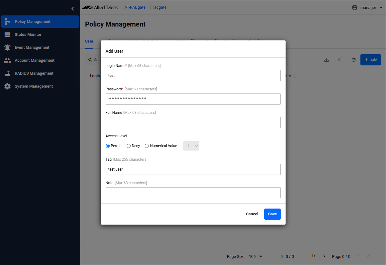 The RADIUS Server authenticates the user who makes the connection request to the NAS. The basic operation of authentication using a RADIUS Server is to verify that the user making the authentication request is registered on the RADIUS Server and to verify whether the credentials (password, etc.) included in the connection request match those registered on the RADIUS Server.User policy is managed on the Policy Management > User page. You can also import using a CSV file.