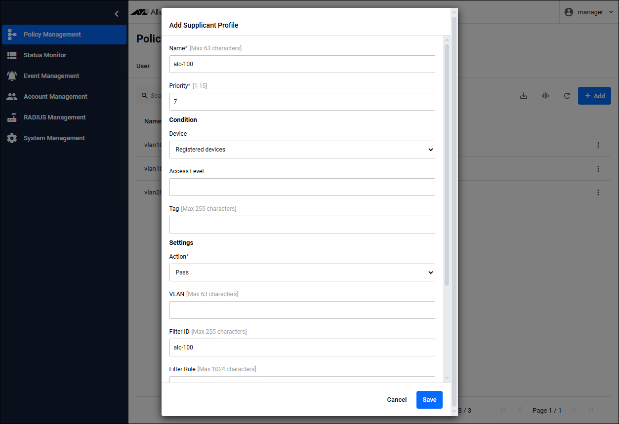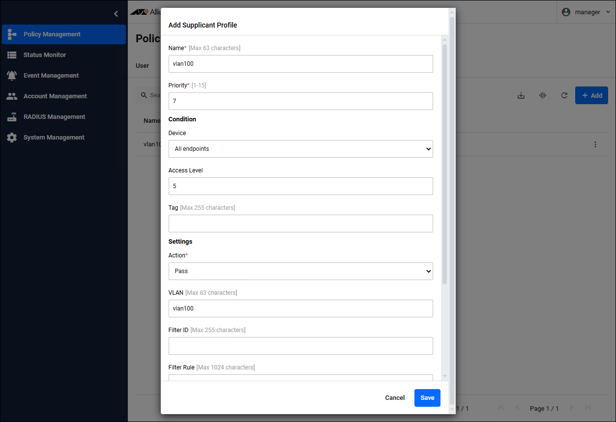 When using the AW+ Switch in conjunction with endpoint authentication, AT-RADgate do not specify the VLAN to which authenticated endpoints are connected by default.Register Supplicant Profile on the Policy Management > Supplicant Profile page. You can also import using a CSV file.