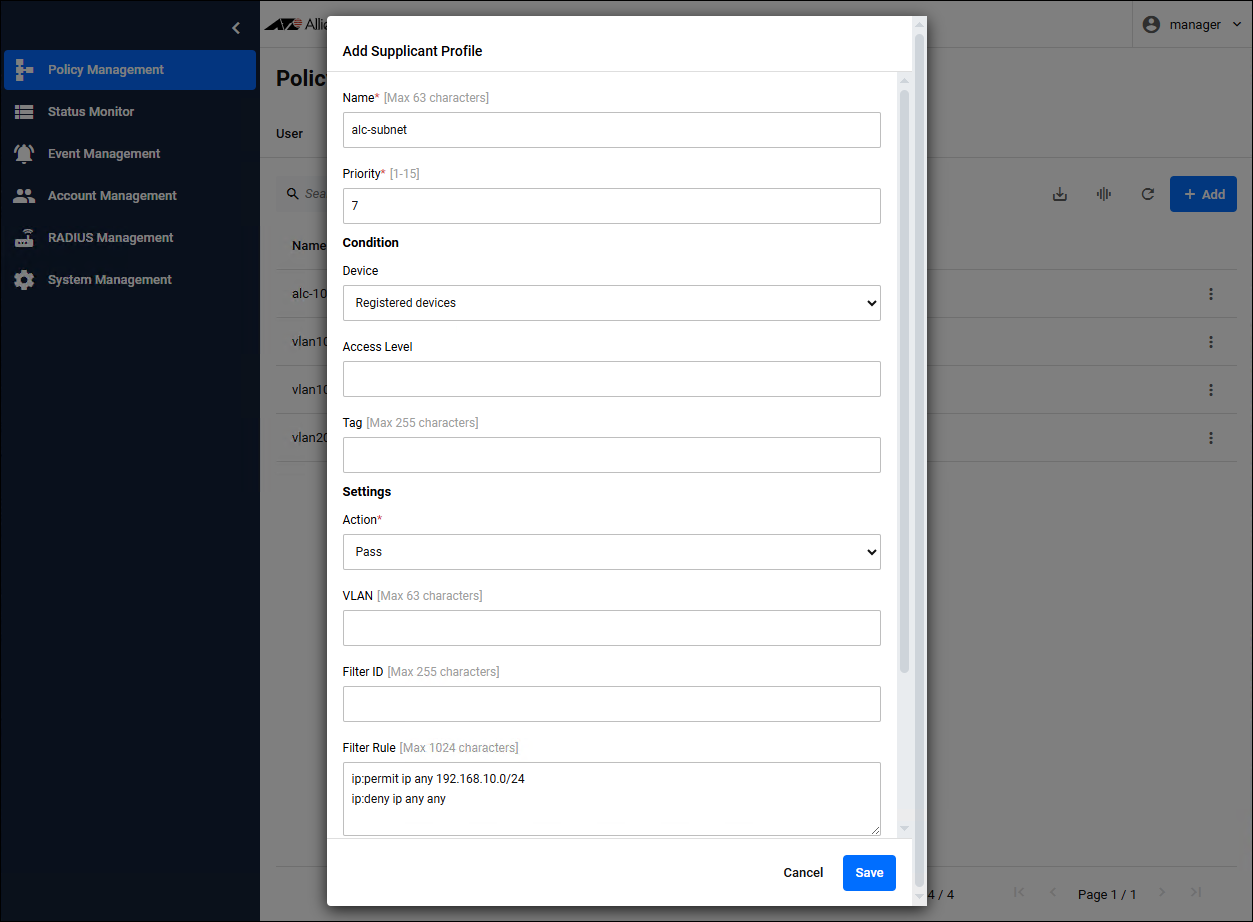 When using AW+ Switch in conjunction with endpoint authentication, you can set an ACL (packet filter) for authenticated endpoints by registering Supplicant Profile.Register Supplicant Profile on the Policy Management > Supplicant Profile page. You can also import using a CSV file.