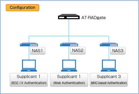 Intelligent Edge Security (IES) uses MAC-based Authentication supported by our AW+ series (including the AT-TQR Wi-Fi router) to centrally manage whether or not supplicants (endpoints) can communicate using Vista Manager EX. AT-RADgate can also be used as an authentication server (RADIUS Server) for intelligent edge security.Intelligent Edge Security is operated using Vista Manager EX, but the following authentication policies must be registered on the AT-RADgate Policy Management page. If you add a NAS to the configuration, register it on the AT-RADgate side.