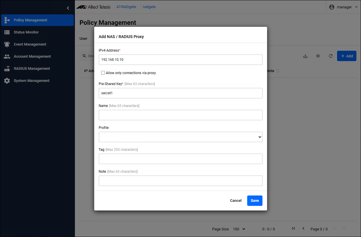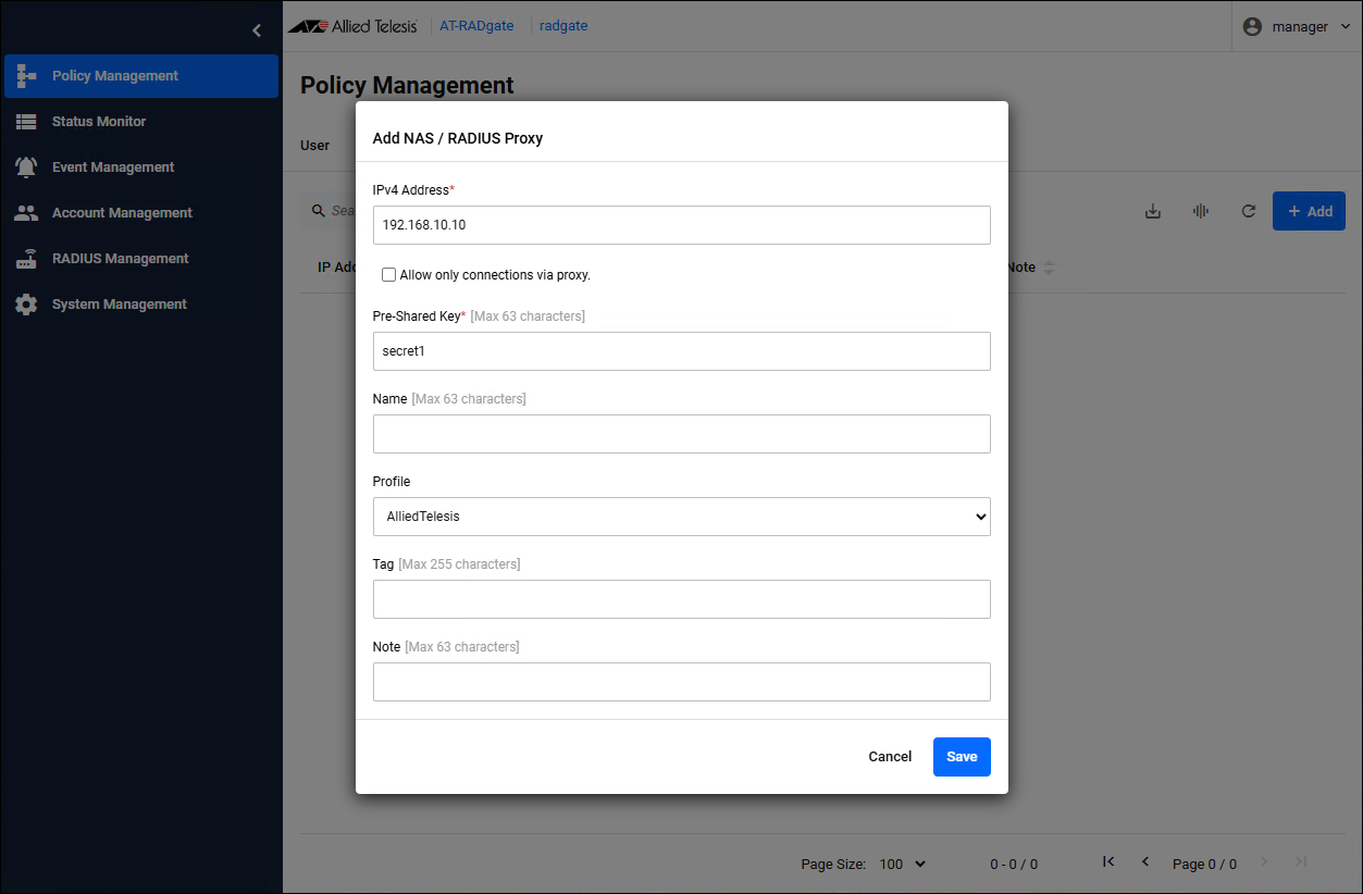 - Register the NAS policy on the AT-RADgate Policy Management page
