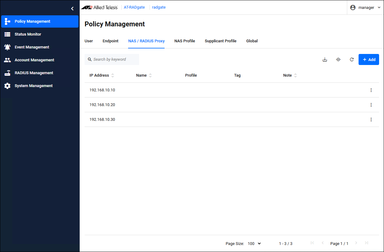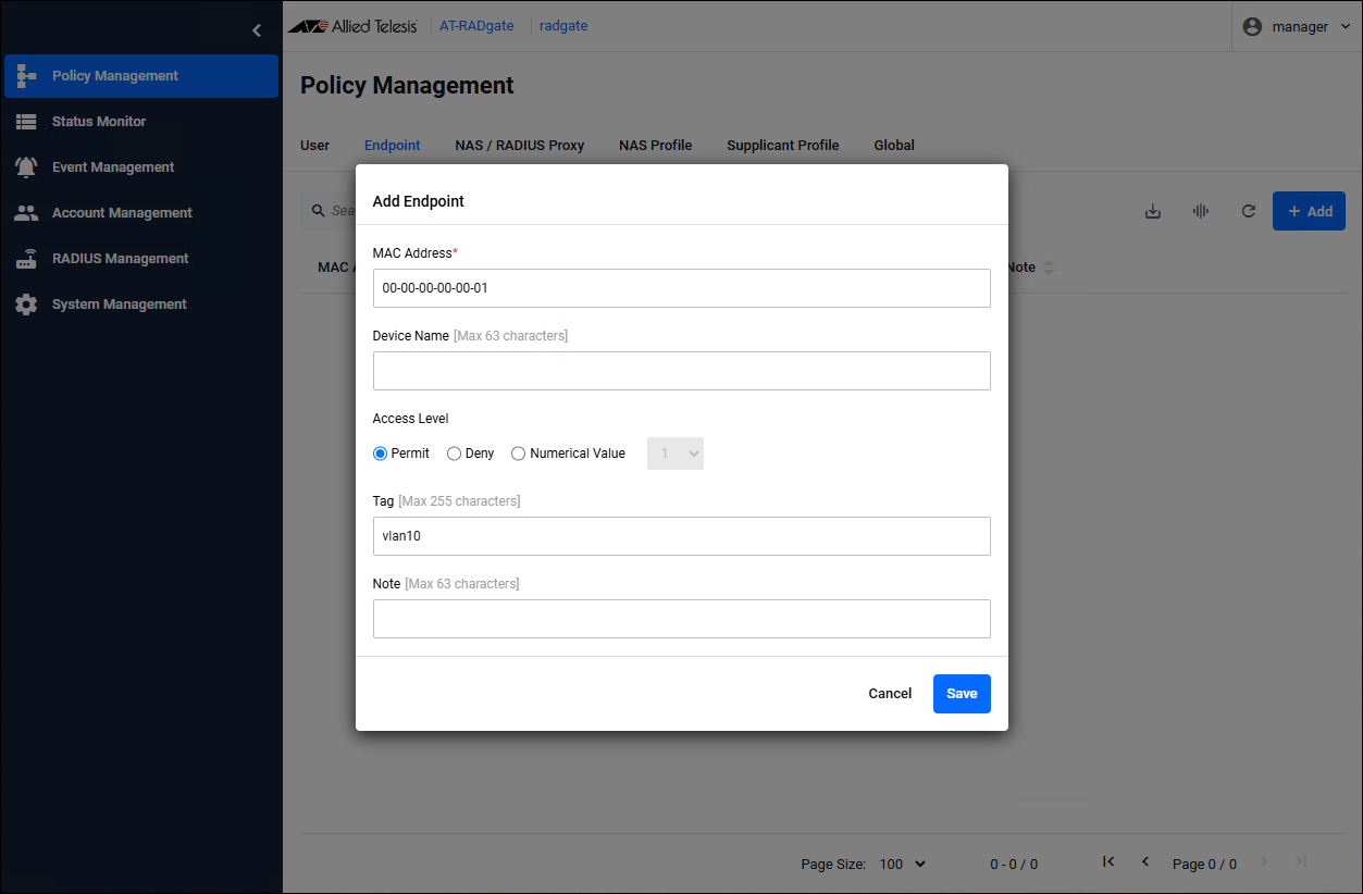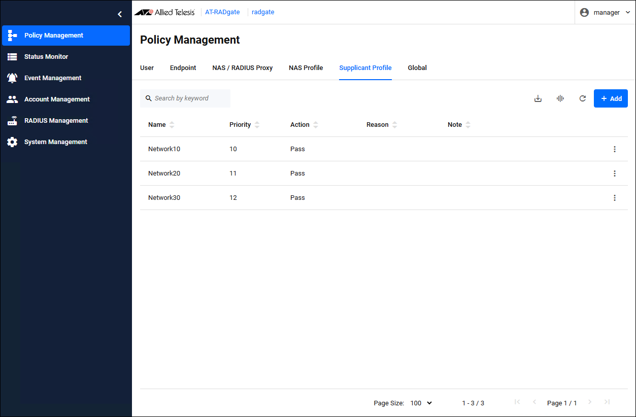 NoteDo not register "Endpoint" and "Supplicant Profile" on the AT-RADgate Policy Management page. These are added via operations on the "Endpoint" tab on the "Asset Management" page of Vista Manager EX, or via "Users" and "Groups" on the "Network Services / RADIUS" page, and are registered in AT-RADgate.For information on operating Intelligent Edge Security, refer to the Vista Manager EX document posted on our website.