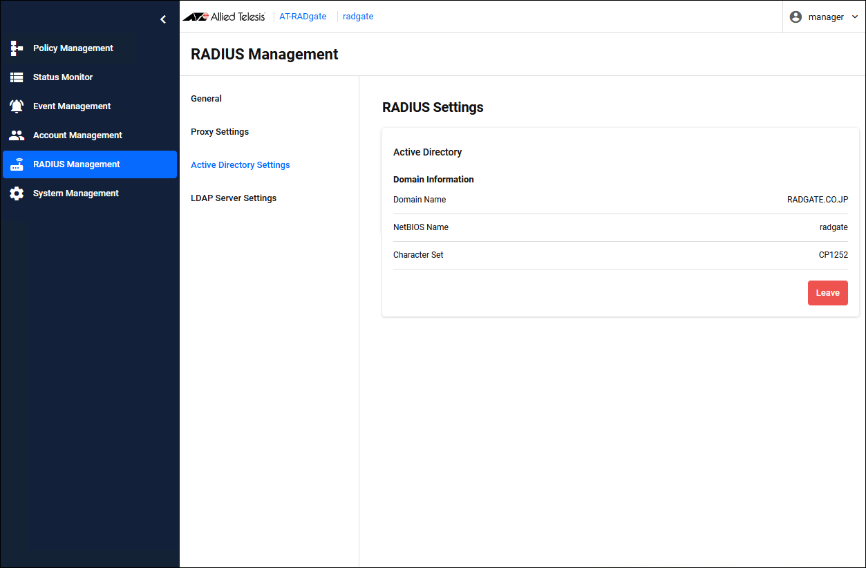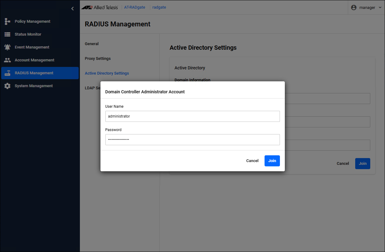 - Register Windows Active Directory settings on the AT-RADgate RADIUS Management page