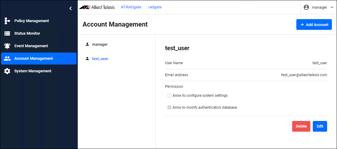| "Delete" button | Delete the selected account. The currently logged in account and the default account "manager" cannot be deleted. |