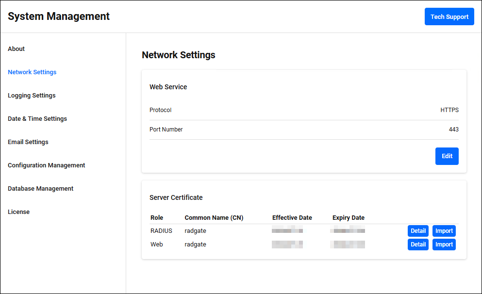 System Management > Network Settings > Server CertificateYou can check and change the certificates used by each AT-RADgate service. Click the "Import" button on the right side of each service row to display a dialog box for uploading the certificate file.