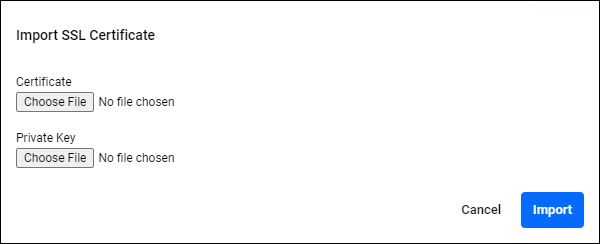 You can upload an SSL certificate file in PEM format. Select the certificate file and private key file and click the "Import" button. If you change the web certificate, a reconnection to the Web UI server is performed (even if you are using the HTTP protocol). In this case, your browser's security warning function may block your connection.