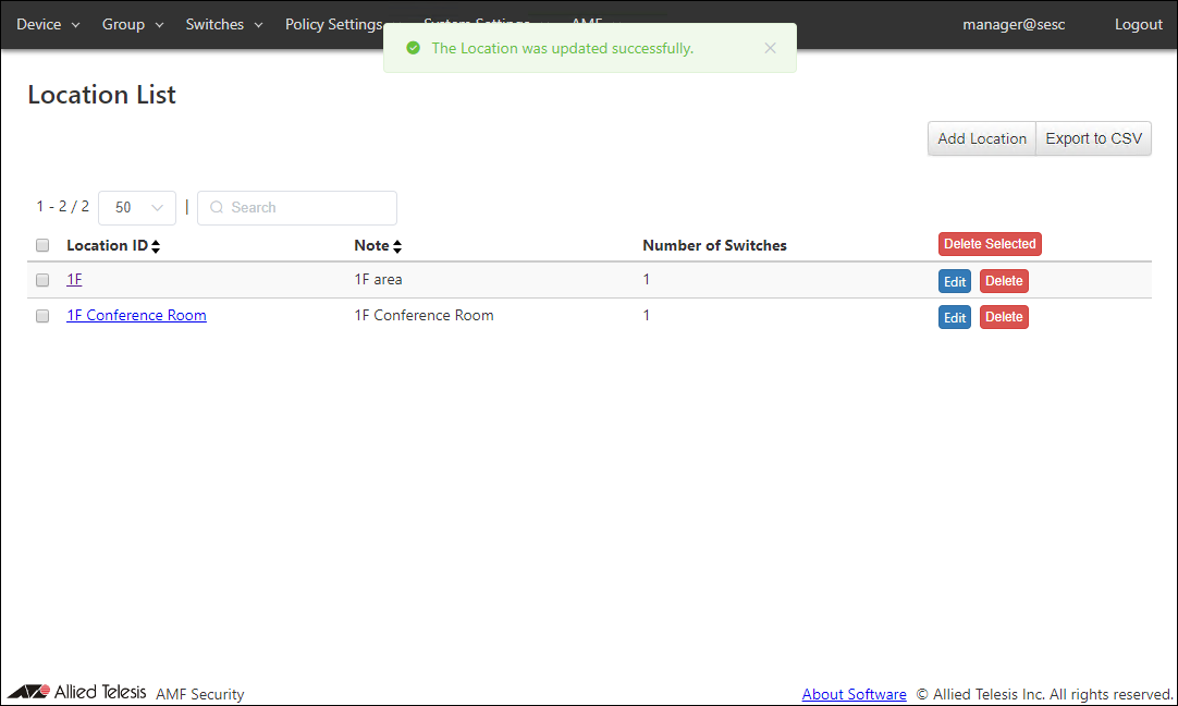This page lists registered locations in AMF Security. At this point, only location "1F" is registered.