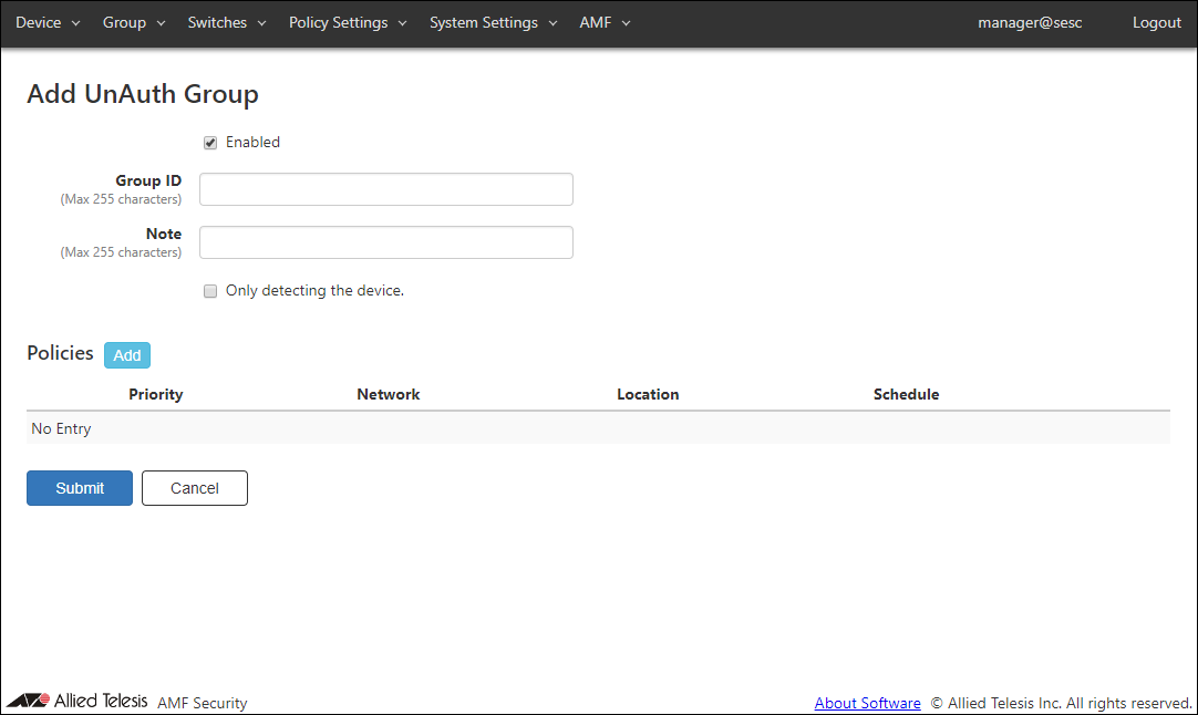 - If you specify Location, the UnAuth Group can access the network only from OpenFlow Switches and AMF Members in the location. If you do not specify Location, the UnAuth Group can access the network from all OpenFlow Switches and AMF Members.
