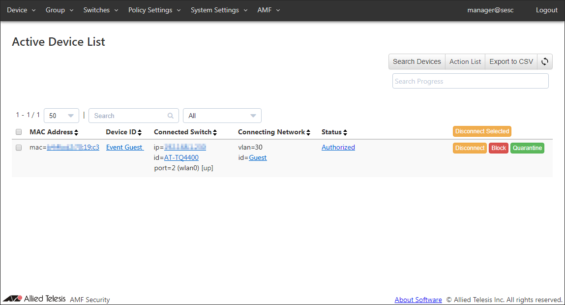 This page shows you the MAC addresses of the devices which are connecting to the OpenFlow Switches or AMF Members registered in AMF Security's database.