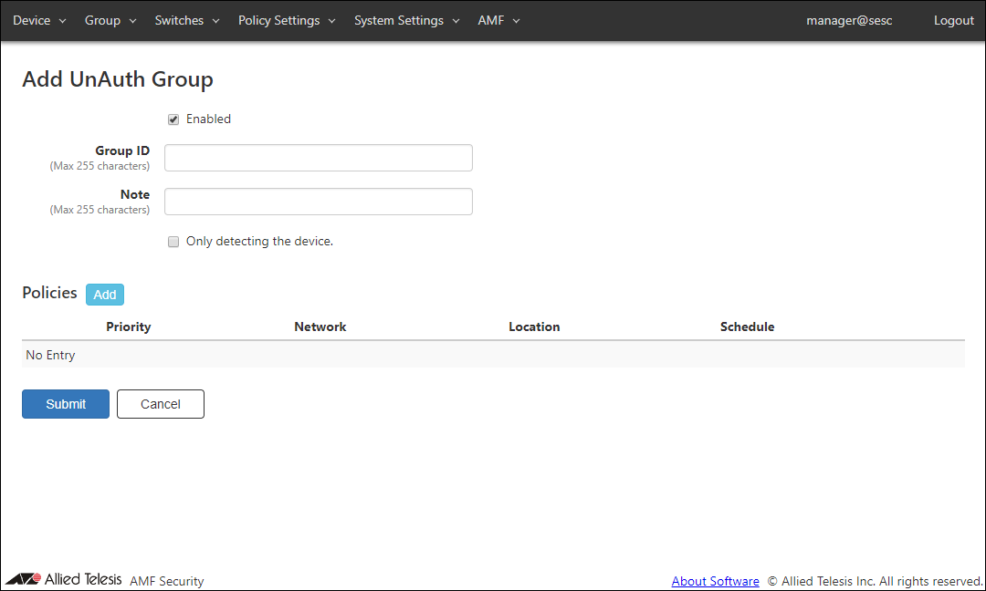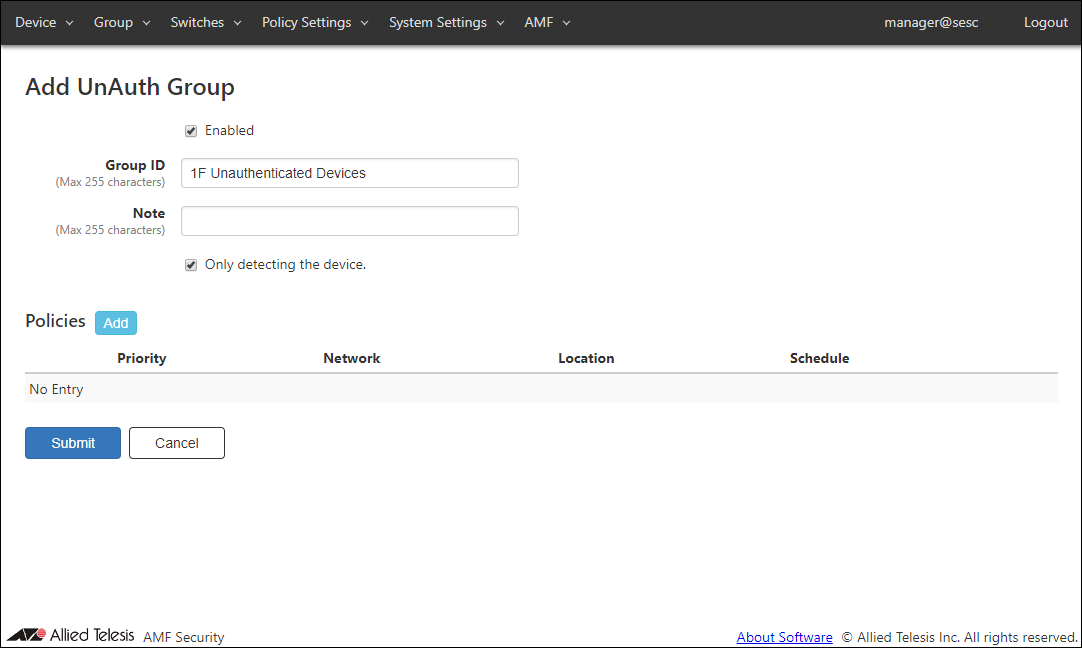 - Click "Submit" to go back to the Group > Add UnAuth Group page.