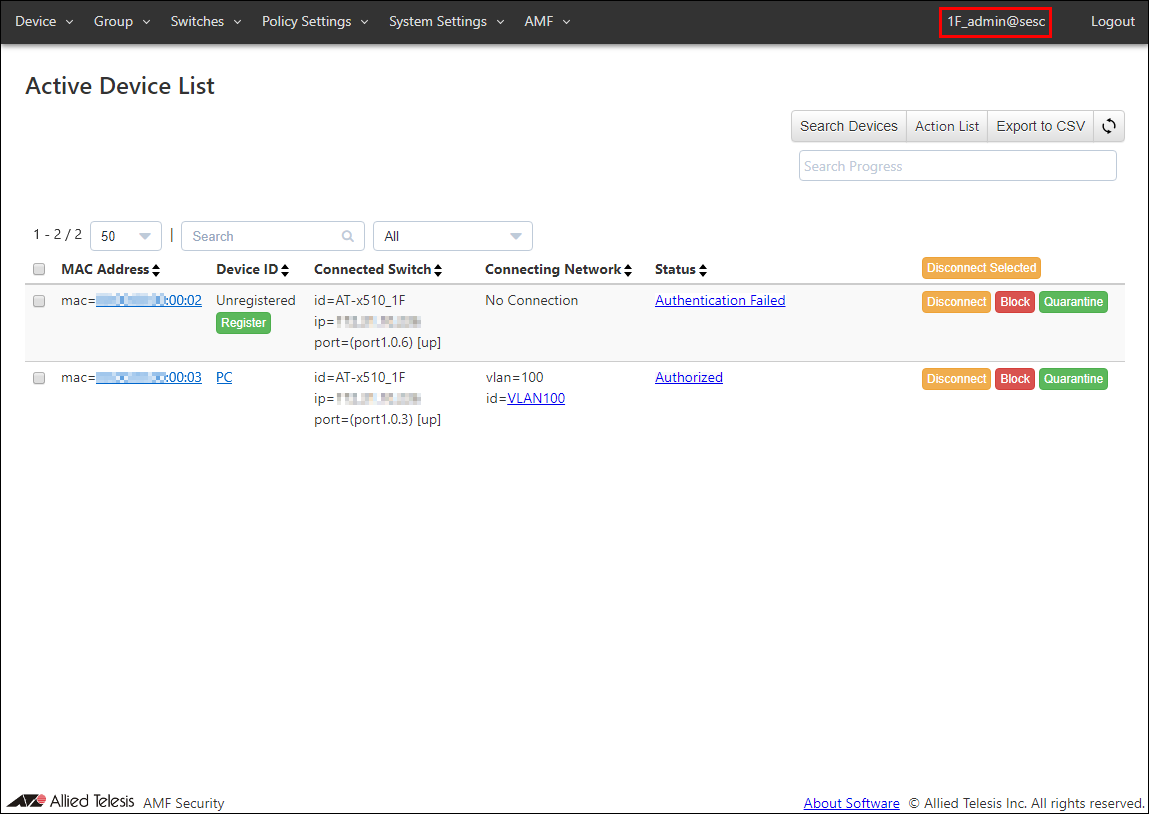 In this case, the display example of the Devices > Active Device List page is as follows.