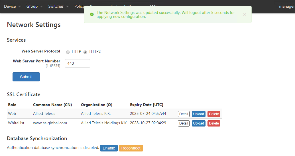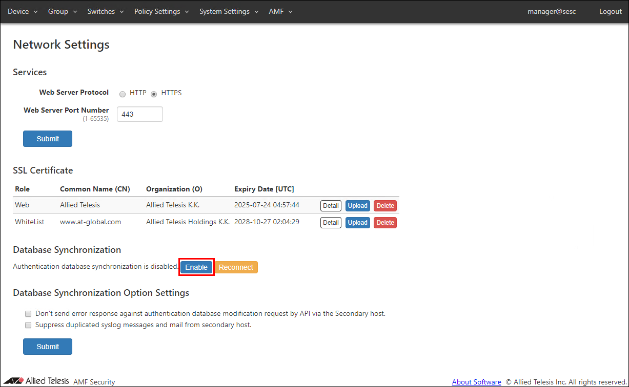 - Display the System Settings > Network Settings page with AMF Security of AT-VST-APL used on the secondary. Click the "Enable" button of the Database Synchronization item.