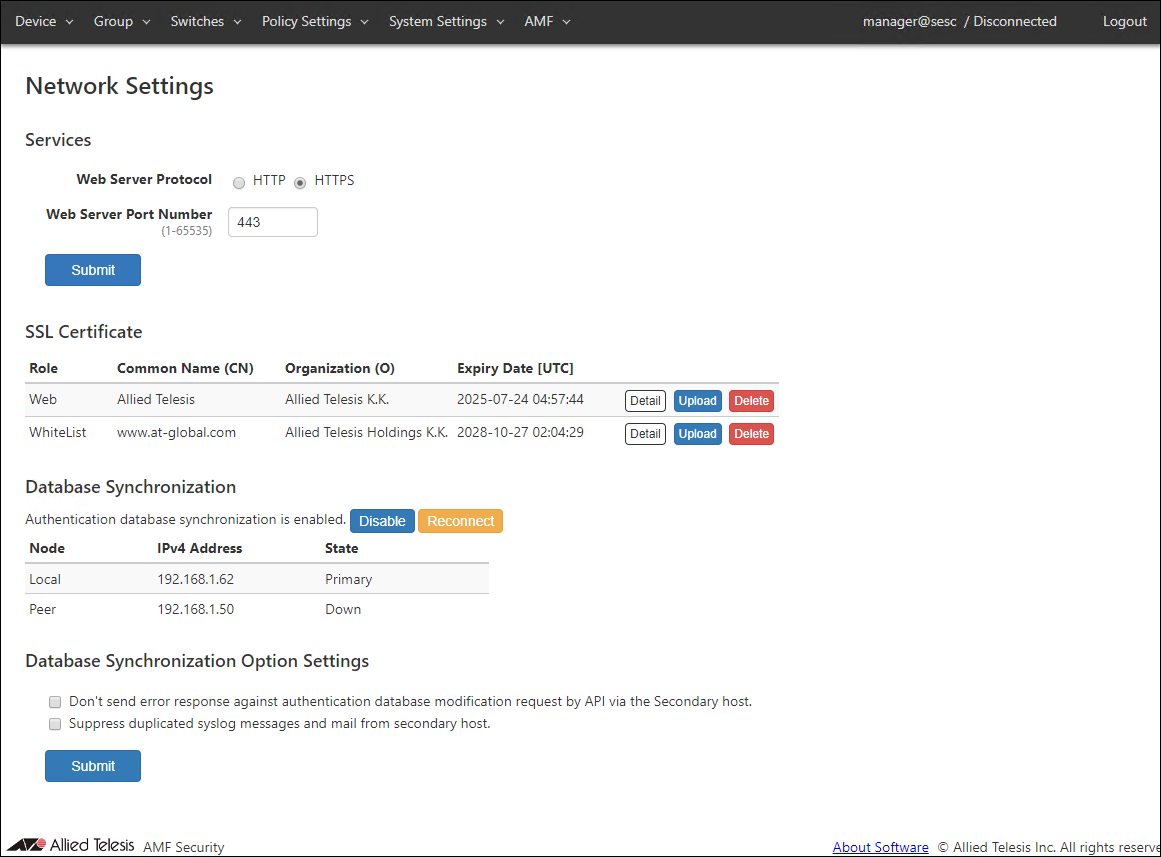 After synchronization, when you log in to the AMF Security web setting screen, follow the host name in the upper right of the screen, such as "manager@sesc / Syncing (Primary)", "manager@sesc / Syncing (Secondary)", The synchronization status is displayed.