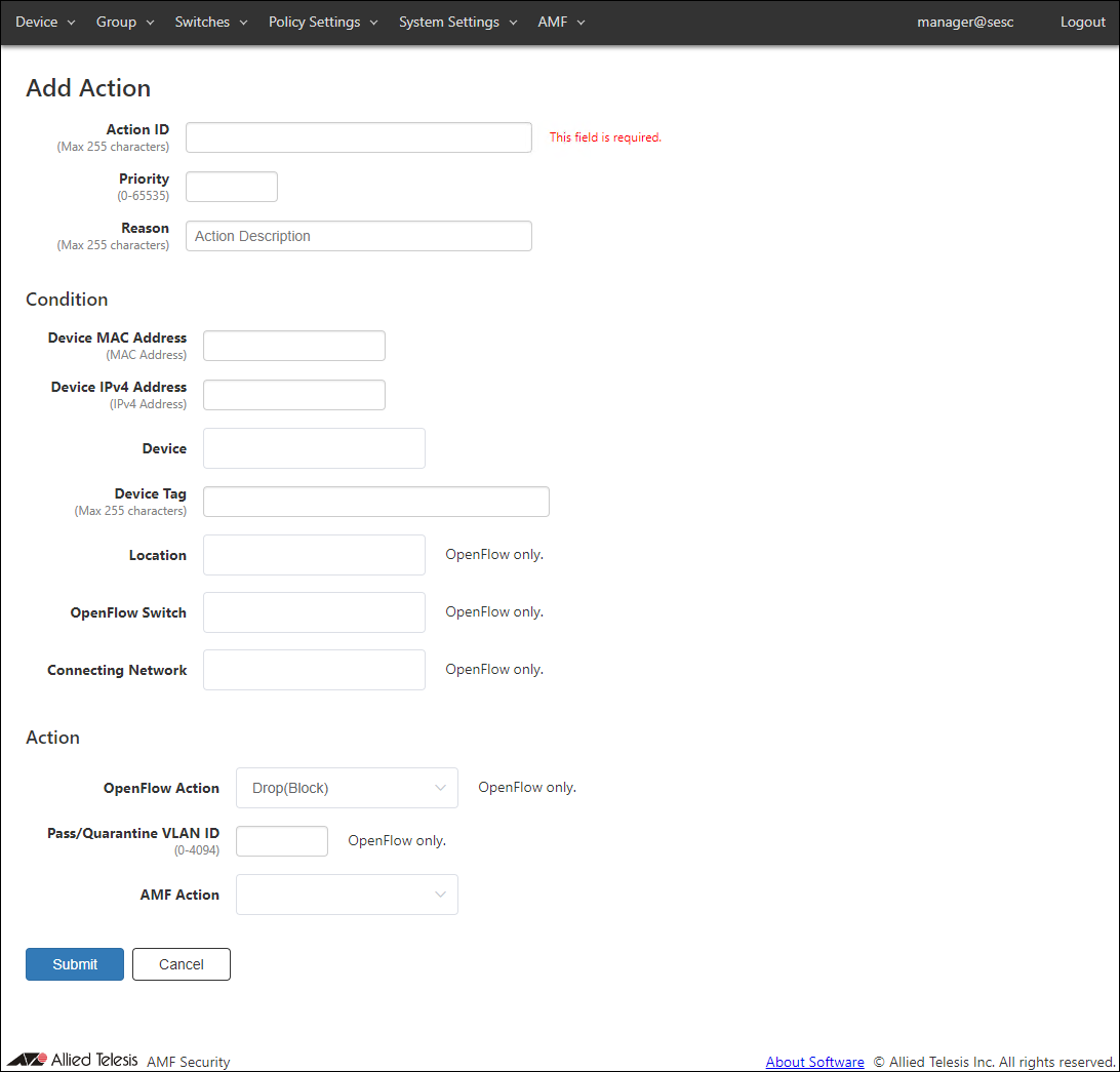 | Action (OpenFlow/AMF) | Action OpenFlow Action (Pass(Permit), Quarantine, Drop(Block) and Log-Only) and AMF Action (Quarantine, Drop Packets, Link-Down and IP-Filter) are displayed. |