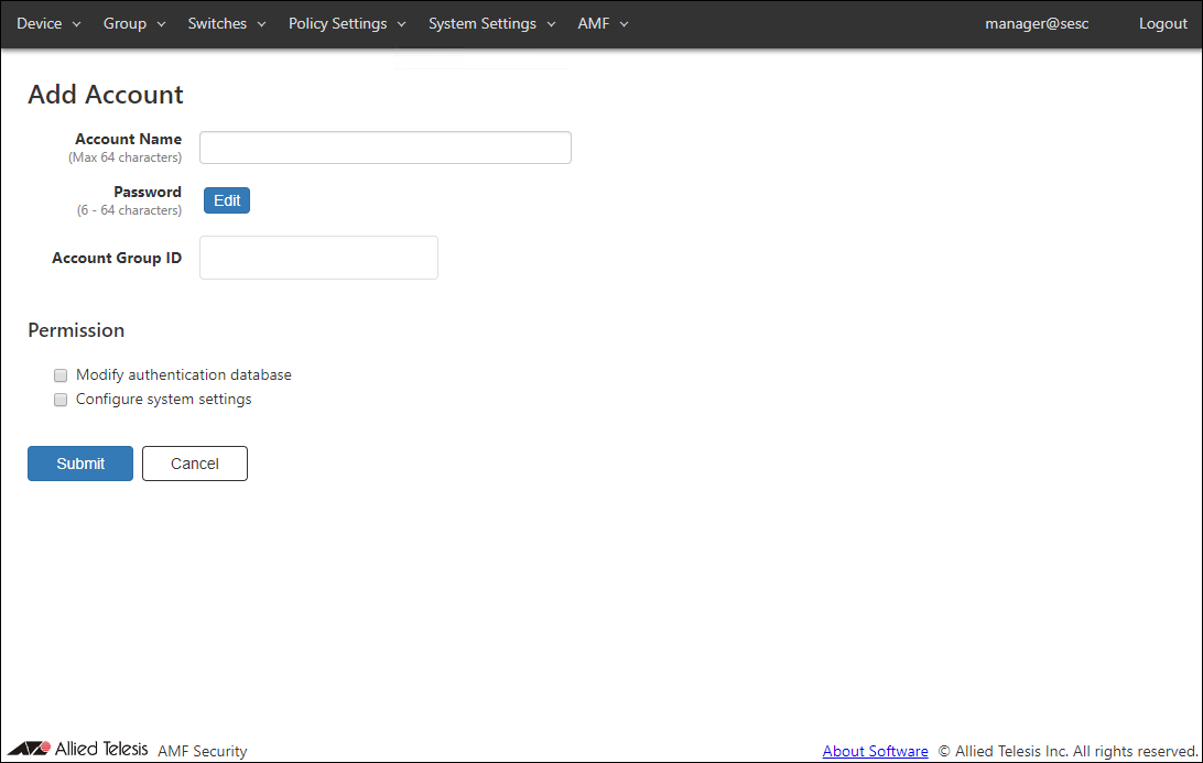 NoteAccount name and permissions of the default account "manager" cannot be changed.
