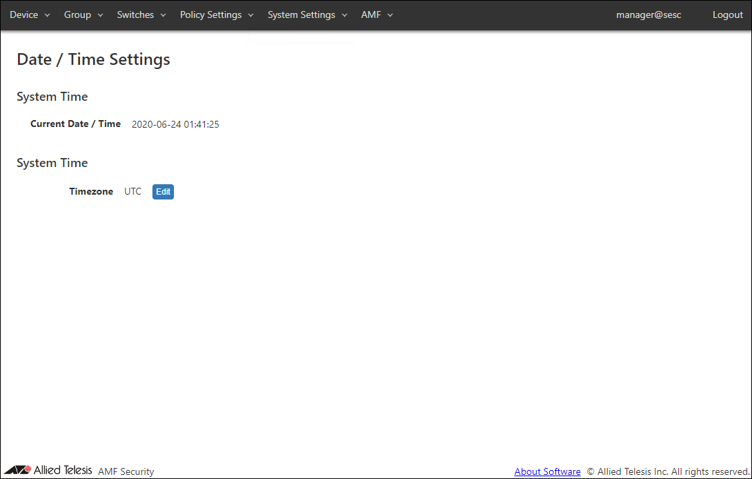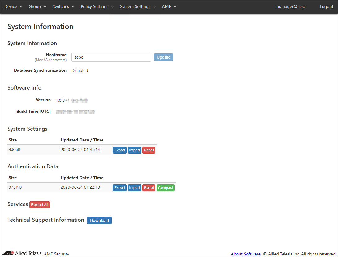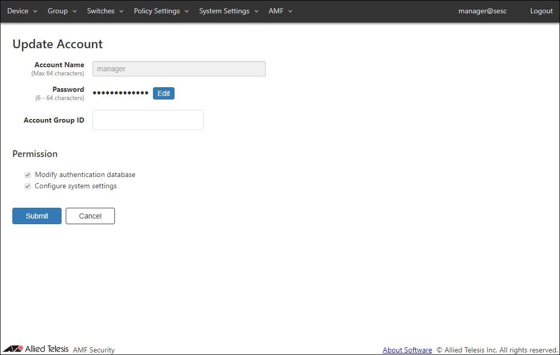 NoteWhen you forget all the passwords for user accounts with "Configure system settings The AMF Security configurations must be initialized if you forget passwords for all accounts with the permission of "Configure system settings" including the "manager" account. Please make sure that you keep your passwords safely and never forget them.