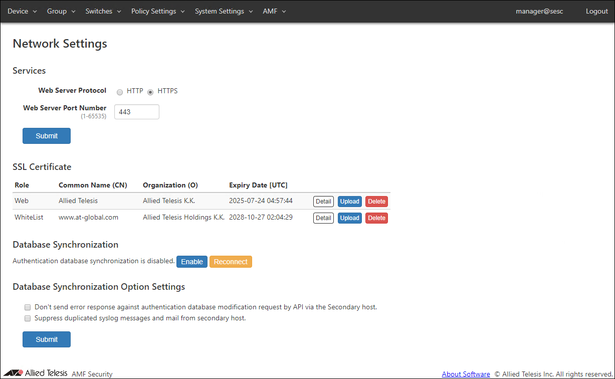NoteThe Device > Active Device List page and Switches > Active OpenFlow Switch List page show the live information retrieved from OpenFlow Switches managed by AMF Security. Therefore, the information displayed on those pages may differ between the primary and secondary's web interfaces.
