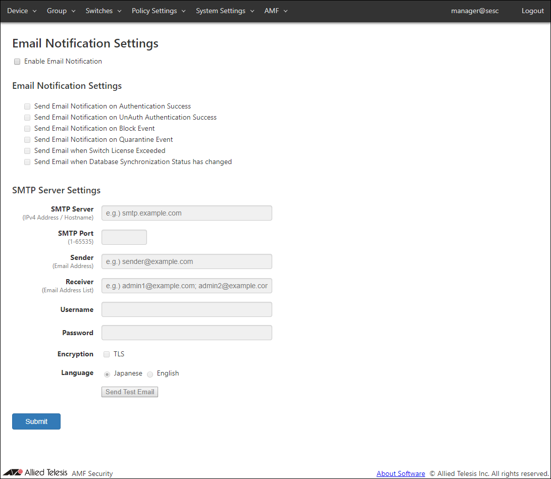 This page lets you configure Email Notifications.You can configure AMF Security to notify an administrator with an email when an event such as device authentication or block happens.
