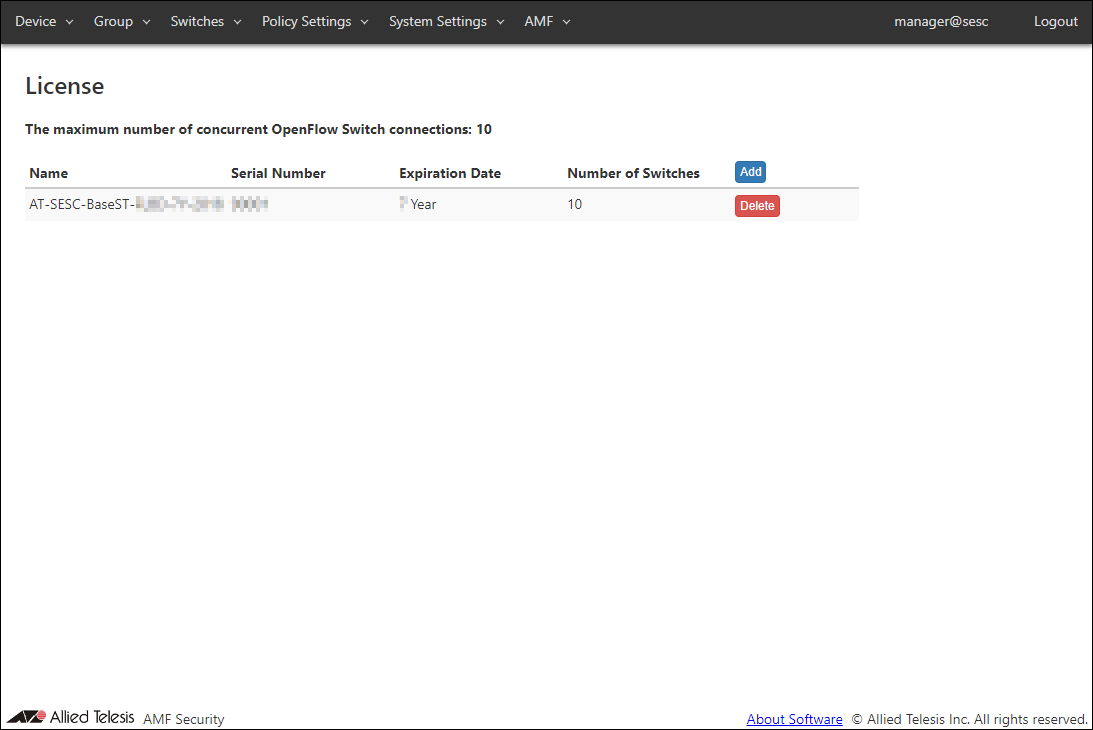 NoteAfter registering the basic license, if you delete or add the basic license during operation of the OpenFlow and AMF Application Proxy network, OpenFlow and AMF Application Proxy may not operate normally.