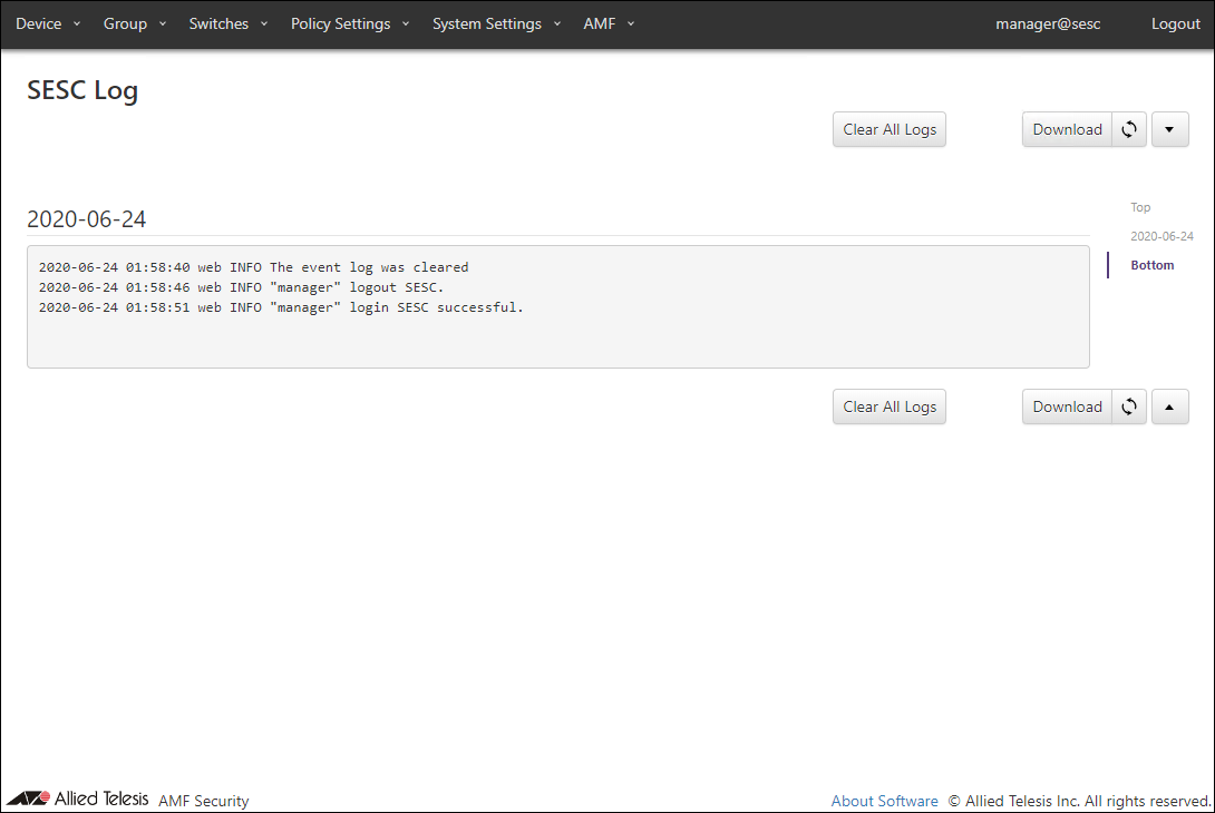 This page shows log messages generated by AMF Security service. The latest 1000 messages are displayed in this page.You can view messages for a specific date by selecting a date at the right side of the page.
