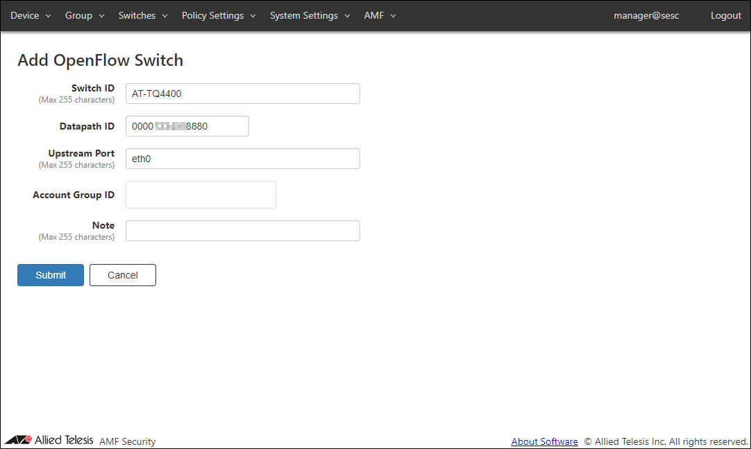 Add a new location where the OpenFlow Switch and the AMF Member are installed.Location can be added on the Policy Settings > Add Location page.