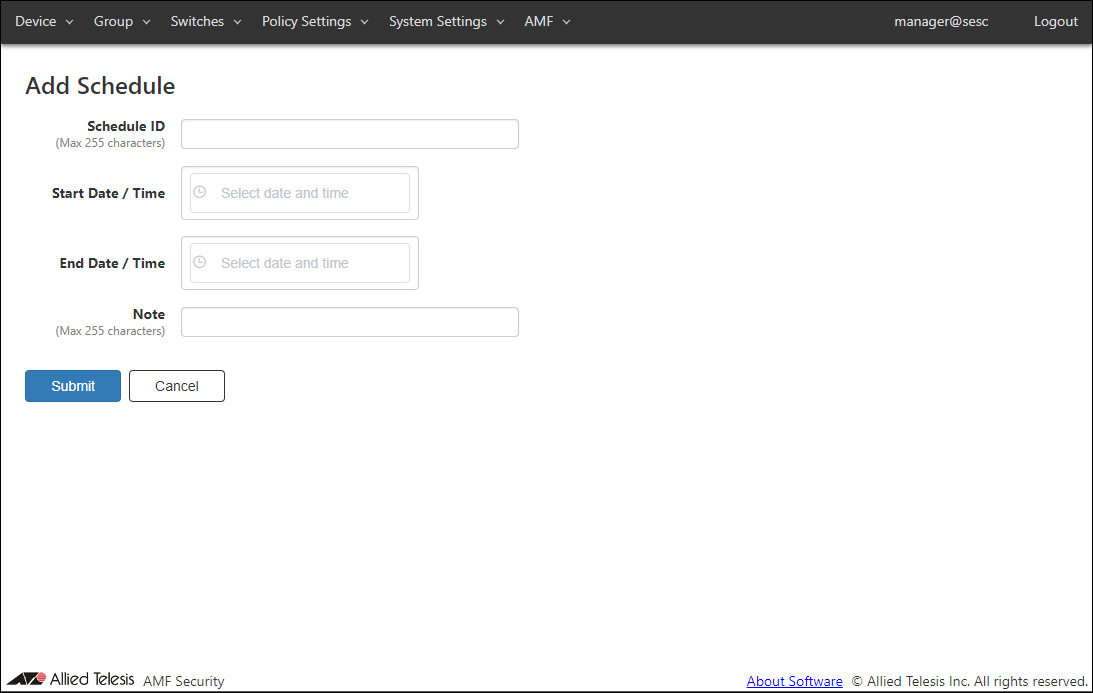 This page shows a list of Schedules.NoteThe Start Date / Time and End Date / Time to be set are the date and time of the timezone currently set on the System Settings > Date / Time Settings page.