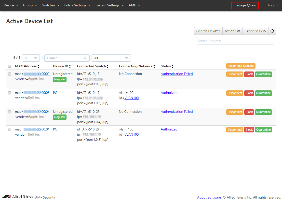 Account Group associates Accounts and Switches (OpenFlow Switches and AMF Members).In the page below, only Switches that have the same Account Group as the Account Group set for the logged-in Account and devices connected to the Switch are displayed.