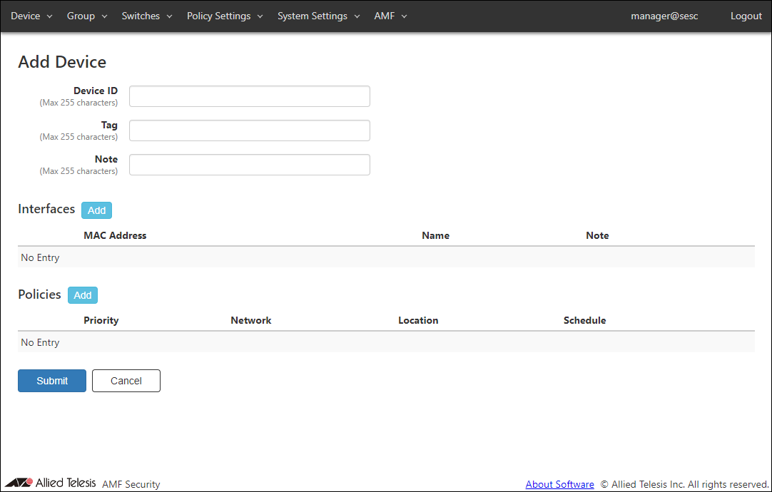 On the Add Device or the Update Device page, the MAC Address is automatically added to the "Interfaces" for the device. Enter additional data such as Device ID, Tag, Note, security policies and other interfaces as required, then click "Submit".