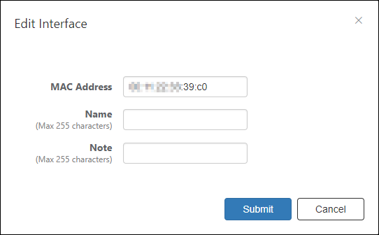 This dialog lets you add a new MAC Address (interface) to the device or update an existing MAC Address (interface) associated with the device.