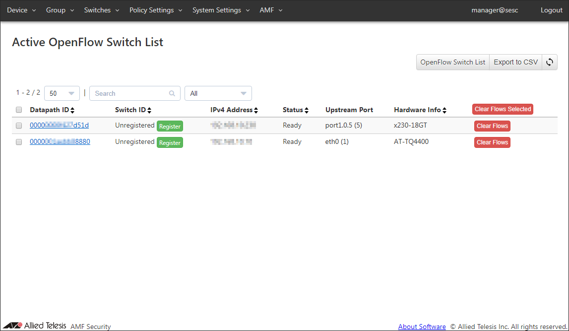 You can view the status of OpenFlow Switches which are connecting to the AMF Security on the Switches > Active OpenFlow Switch List page.- Open the Switches > Active OpenFlow Switch List page.