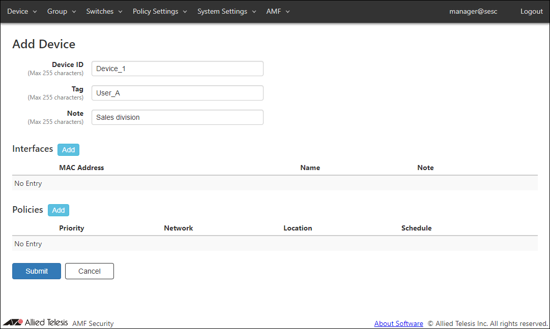 AMF Security can control access to the network by registered devices.Devices can be added on the Device > Add Device page.
