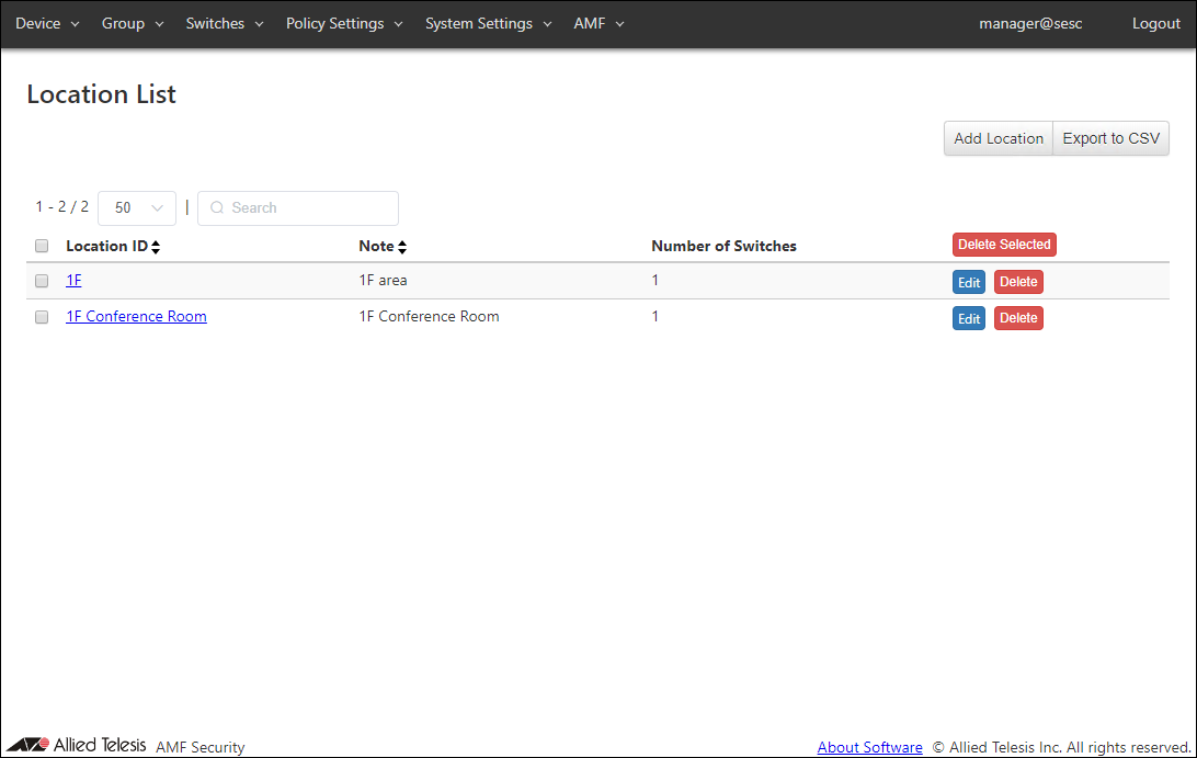 This page lets you add a new Location and associate OpenFlow Switches and AMF Members with the location.If you specify an added Location for a device, the device can access the network only from the OpenFlow Switches and AMF Members associated with the location.