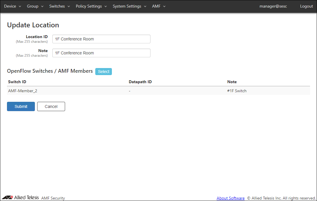 | Submit | Add the checked OpenFlow Switches or AMF Members to the location. |