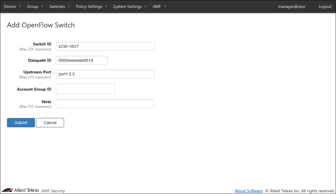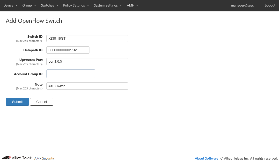 Max 255 characters. Can use alphanumeric, hyphen (-) and underscore (_).Account Group ID (None) Select Account Group ID to which AMF Member belongs. Note #1F Switch Arbitrary string (comment) for the AMF Member.
