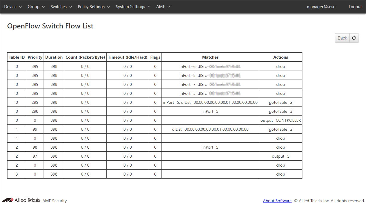 OpenFlowスイッチが持つ、AMF Securityから送られたフローを表示します。