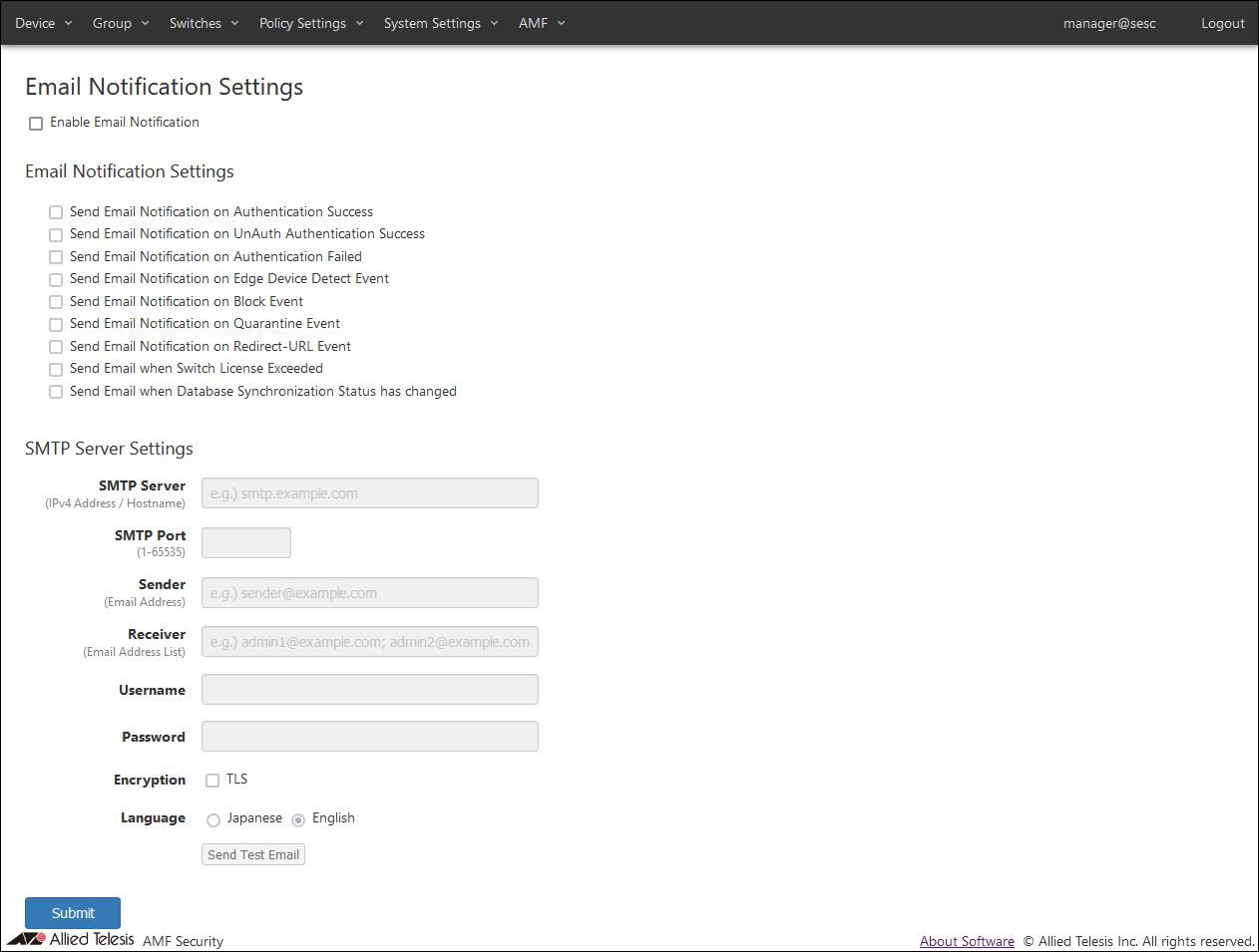 Note◼ SMTP Server Settings"Send Email Notification on Block Event" or "Send Email Notification on Quarantine Event" is checked, AMF Security also sends notification email when a device is blocked or quarantined by AMF Application Proxy.