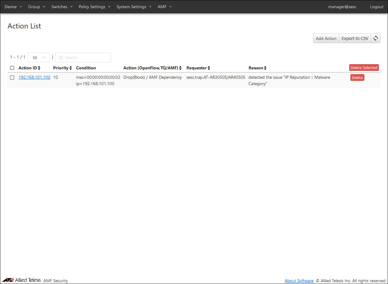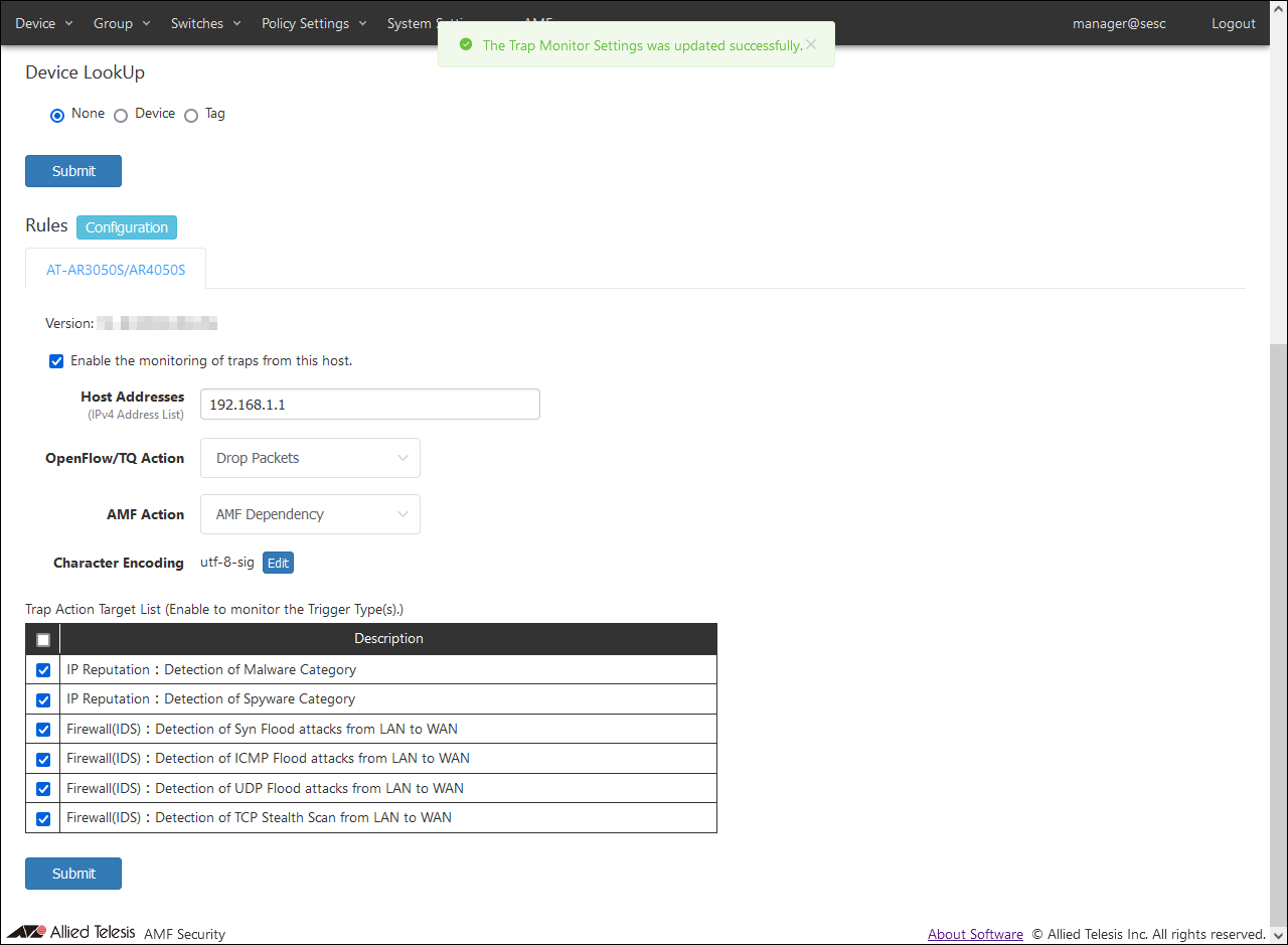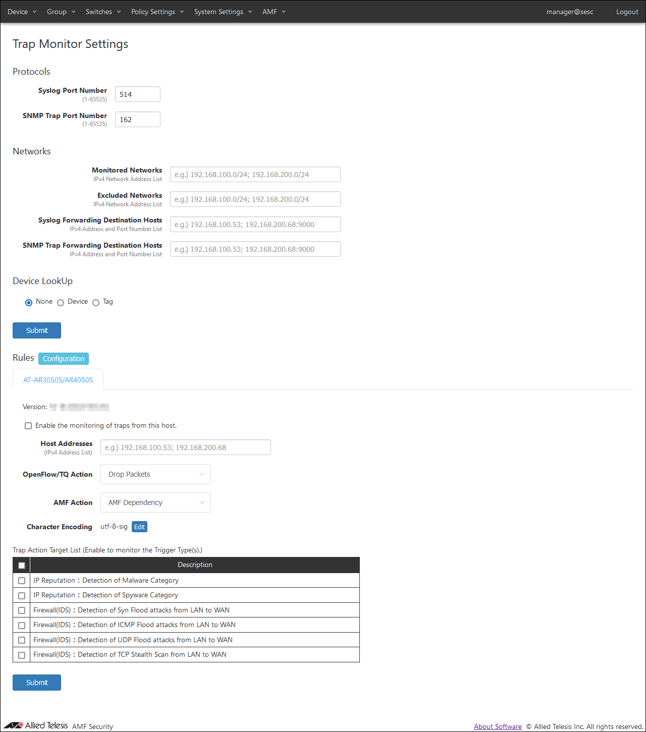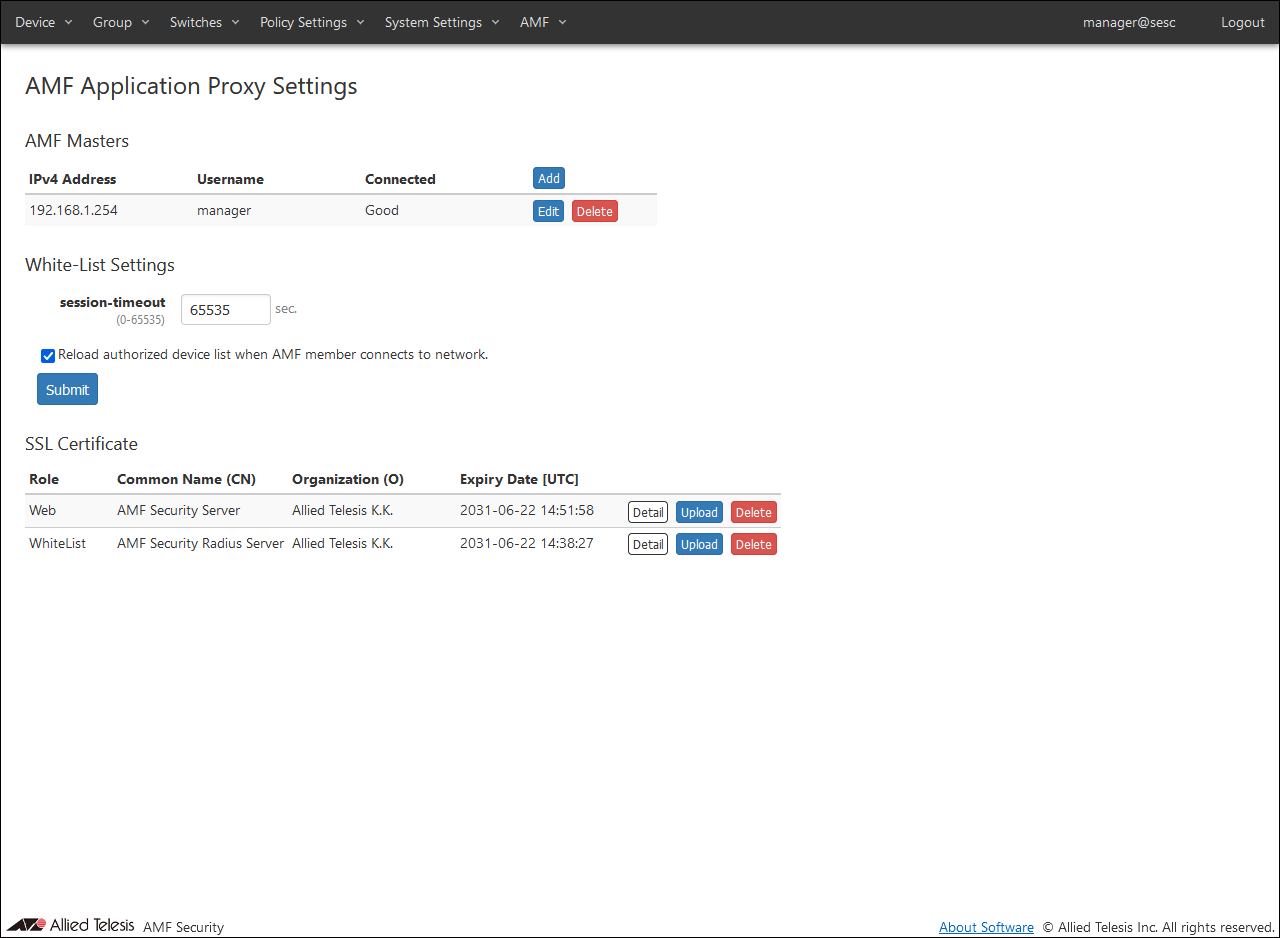 NoteFor details on AMF Security basic settings (application settings) performed with AT-VST-APL, refer to the AT-VST-APL document posted on our website.