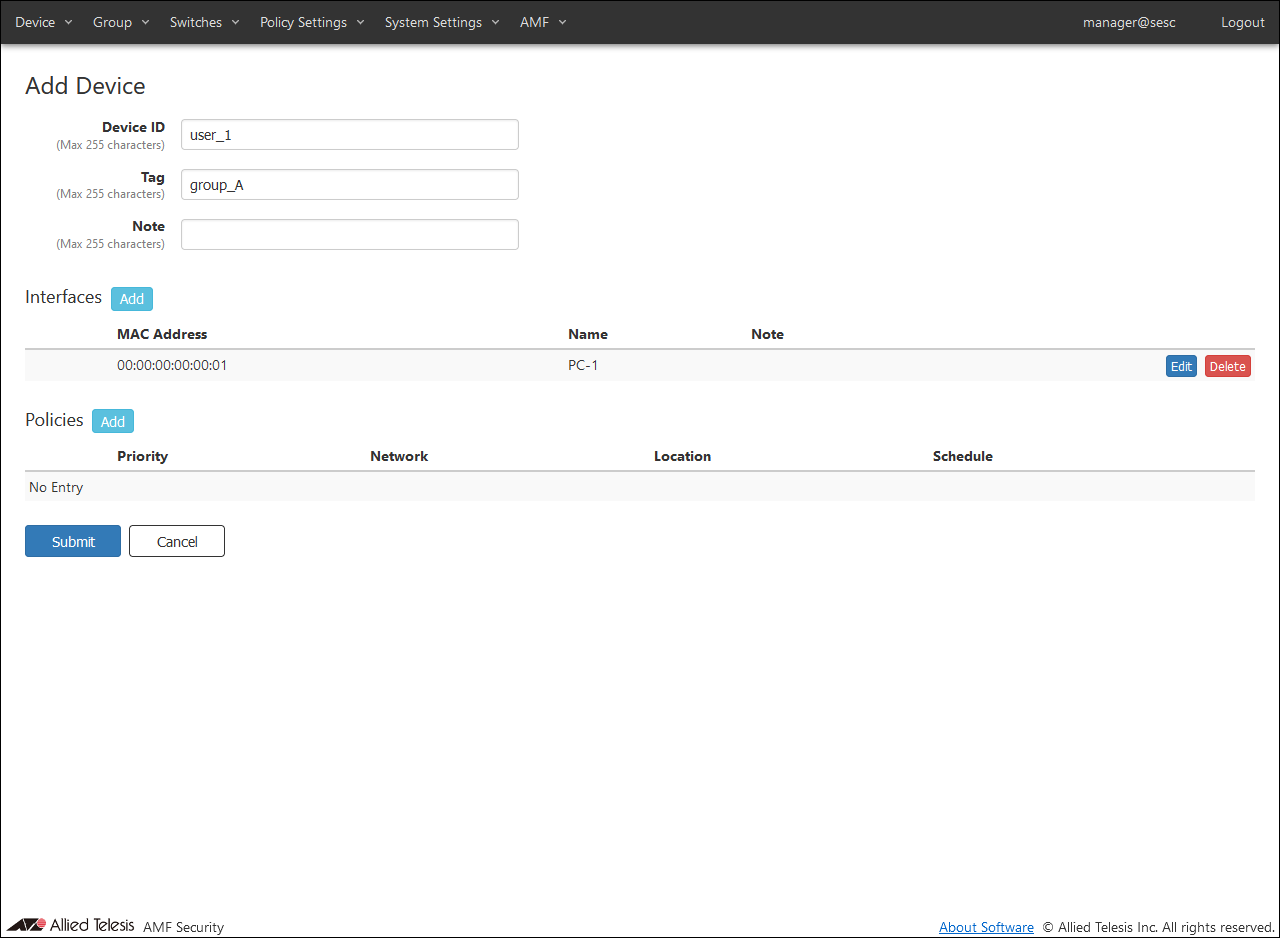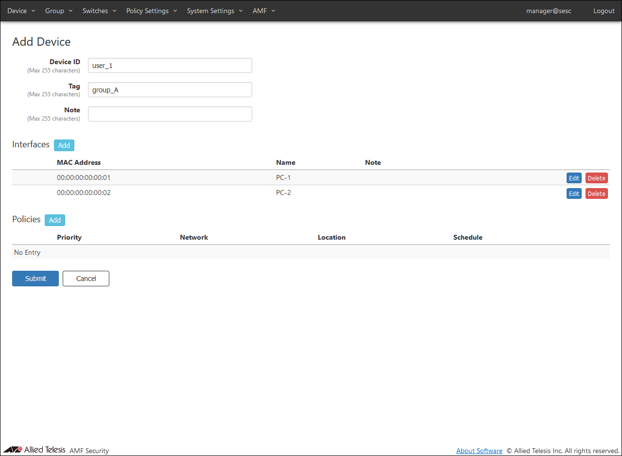 Table 21: Configurable fields Item Name Value MAC Address 00:00:00:00:00:02 Name PC-2 Note (empty) - Since no policy is set for this device "user_1", just click the "Submit" button.