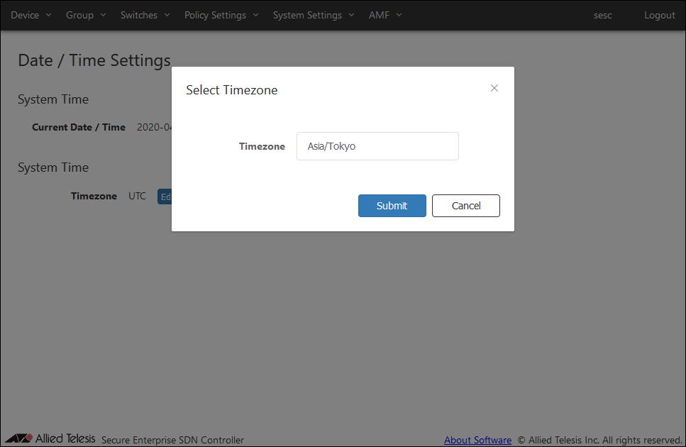 - The Select Timezone dialog is displayed. Select the "Asia/Tokyo" from the drop-down list and click the "Submit" button.